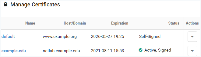 You will be replacing the self-signed certificate that you created. The default certificate is indicated to be the active certificate. This is necessary since you cannot replace an active certificate. If the default is not currently the active certificate, select it and the option to activate it on the Action dropdown.
