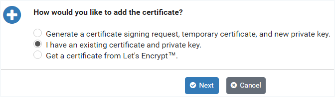This option allows you to import a signed certificate and private key that you have already created. This is typically used when you have a domain-level certificate.