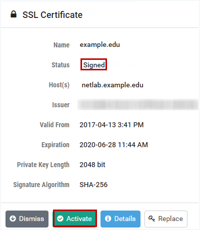 Verify that the signed certificate is now active (see the Status in the picture below). If the signed certificate is not active, it may be necessary to log off the system, close your browser window, and then re-enter the system.