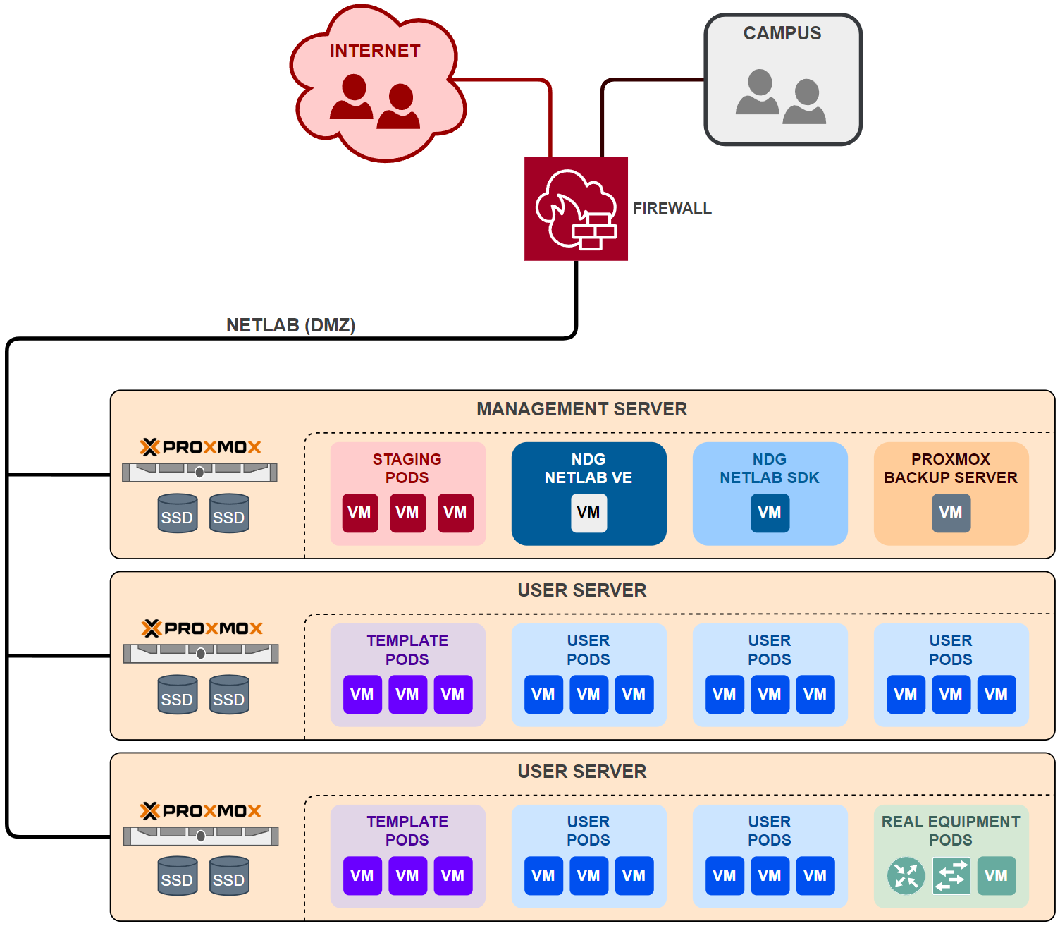 One of the most important aspects of NETLAB+ is its networking capabilities. By design, NETLAB+ is a proxy server that isolates both infrastructure and user pods from the campus and Internet. All normal user access flows through a single IP address (the NETLAB+ server IP address) and a single TCP port (HTTPS 443). The diagram below illustrates the logical network environment of NETLAB+.