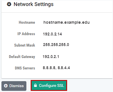 The Network Settings page allows you to review current network settings and configure the NETLAB+ system to use a signed SSL/TLS certificate.