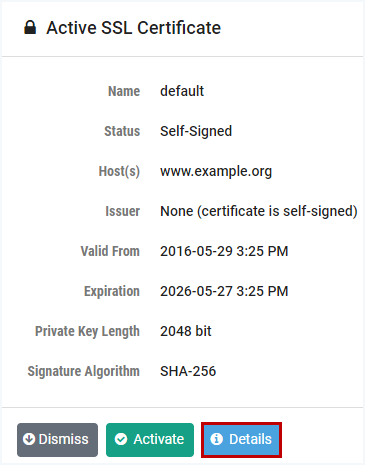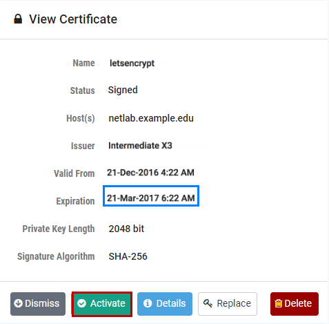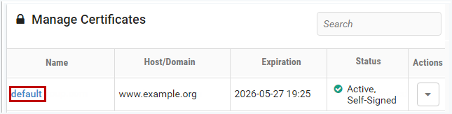 You will be replacing the self-signed certificate that you created. The default certificate is indicated to be the active certificate. This is necessary since you cannot replace an active certificate. If the default is not currently the active certificate, select it and the option to activate it on the Action dropdown.