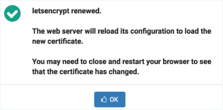 A message will indicate that the certificate has been activated and that the webserver will restart shortly to clear its SSL cache.
