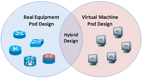 A hybrid pod contains both real equipment and virtual machines. Hybrid pods are useful for labs that require both real equipment and virtual machines.
