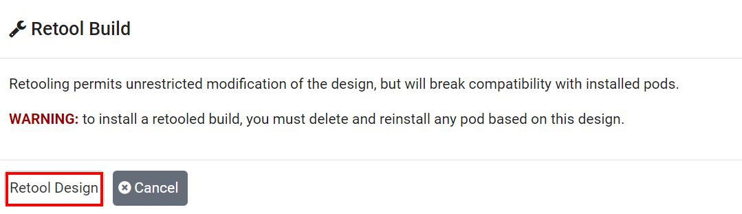 Retooling will require you to reinstall any actual pods based on the design. The extent of the modifications that may be performed using the Retool option allow modifications to the pod design which can significantly change it from the previous build. Reinstalling any pods using the design is necessary in order to prevent access conflicts to control resources. If you do not wish to reinstall pods, consider cloning the pod design instead – current pods will continue to use the original design and new can be created using the cloned design.